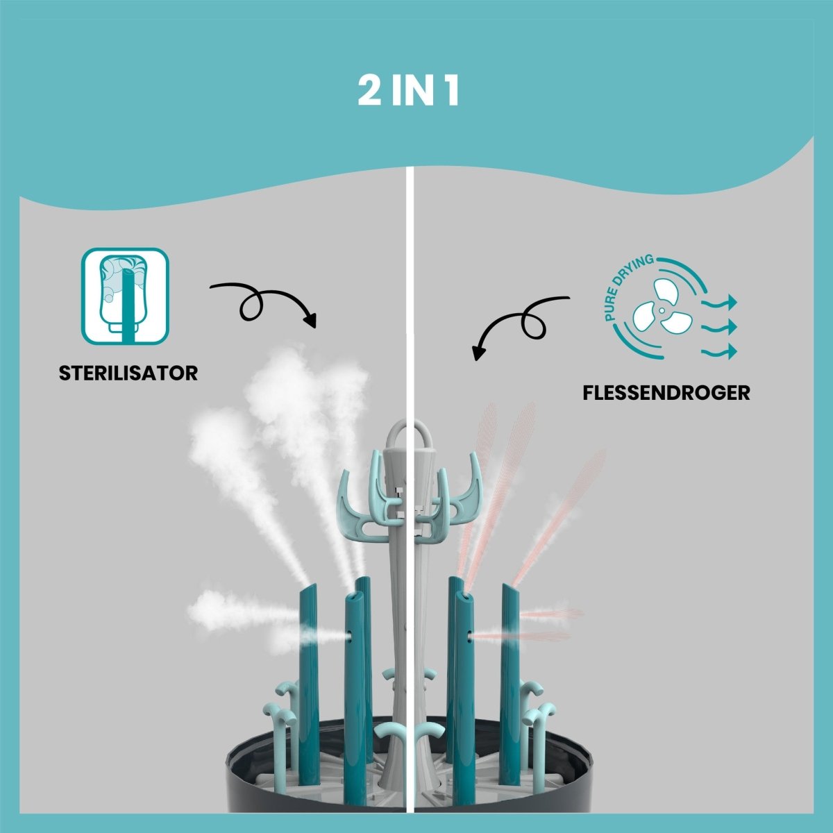 Turbo Pure steriloi ja kuivaa tuttipullot ja tarvikkeet sekä säilyttää ne bakteerittomassa ympäristössä. Luonnollista ja helppoa!