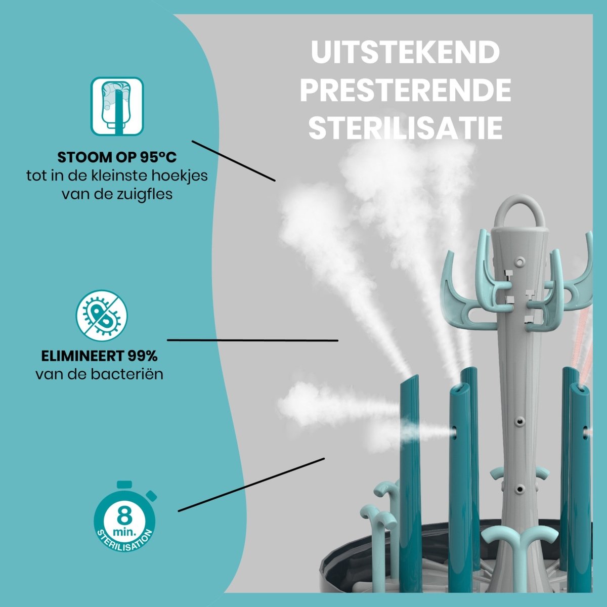 Turbo Pure käyttää innovatiivista teknologiaa. Se steriloi tuttipullot suoraan ytimeen asti vain 8 minuutissa. Turbo Pure tuottaa jopa 95 °C:n höyryä, joka tappaa vastustuskykyisimmätkin bakteerit (99%), poistaa sitkeät hajut ja maitosta syntyneen kalkkikertymän. Höyry on luonnollista eikä sisällä kemikaaleja. Sterilisaattorin suuttimet ovat irrotettavia, mikä lisää laitteen monipuolisuutta. Voit asettaa laitteeseen jopa 6 tuttipulloa, mutta myös rintapumpun, tutit ja muut steriloitavat tarvikkeet.