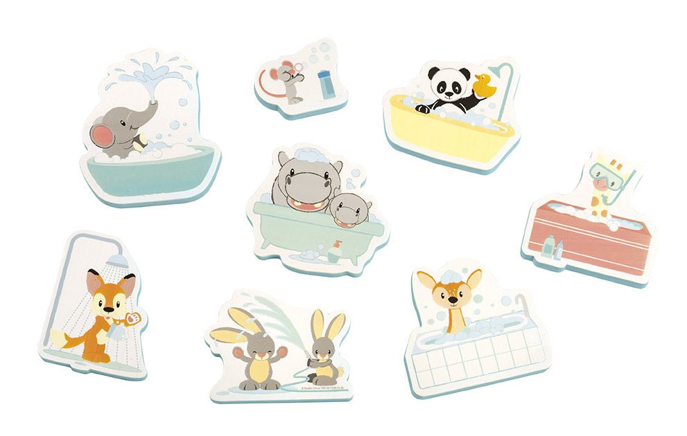 Kylpyhuoneen leikit muuttuvat vieläkin hauskemmiksi Studio Circusin kavereiden kanssa. Nämä vaahtomuovihahmot tarttuvat kylpyammeen reunaan tai laattaseinään ja kelluvat vedessä. Leikin jälkeen ne on helppo säilyttää verkkopussissa, joka kiinnittyy imukuppien avulla sileään pintaan.