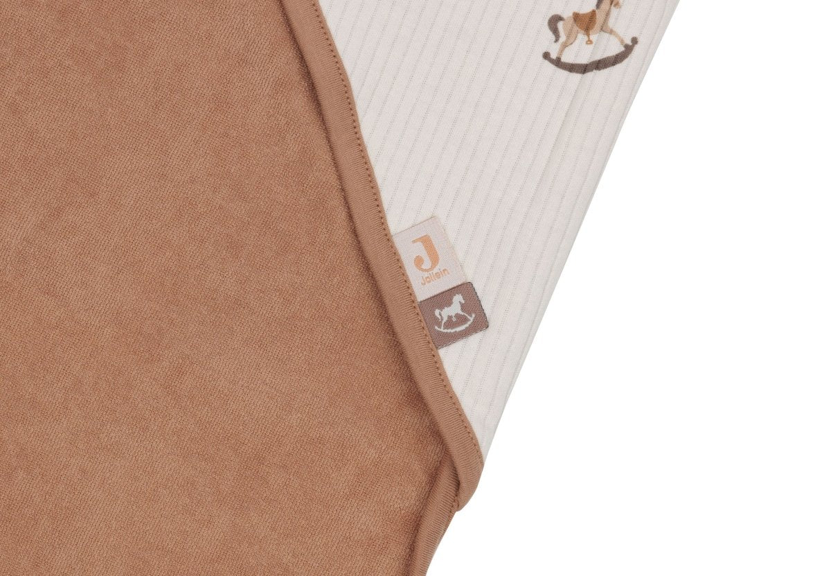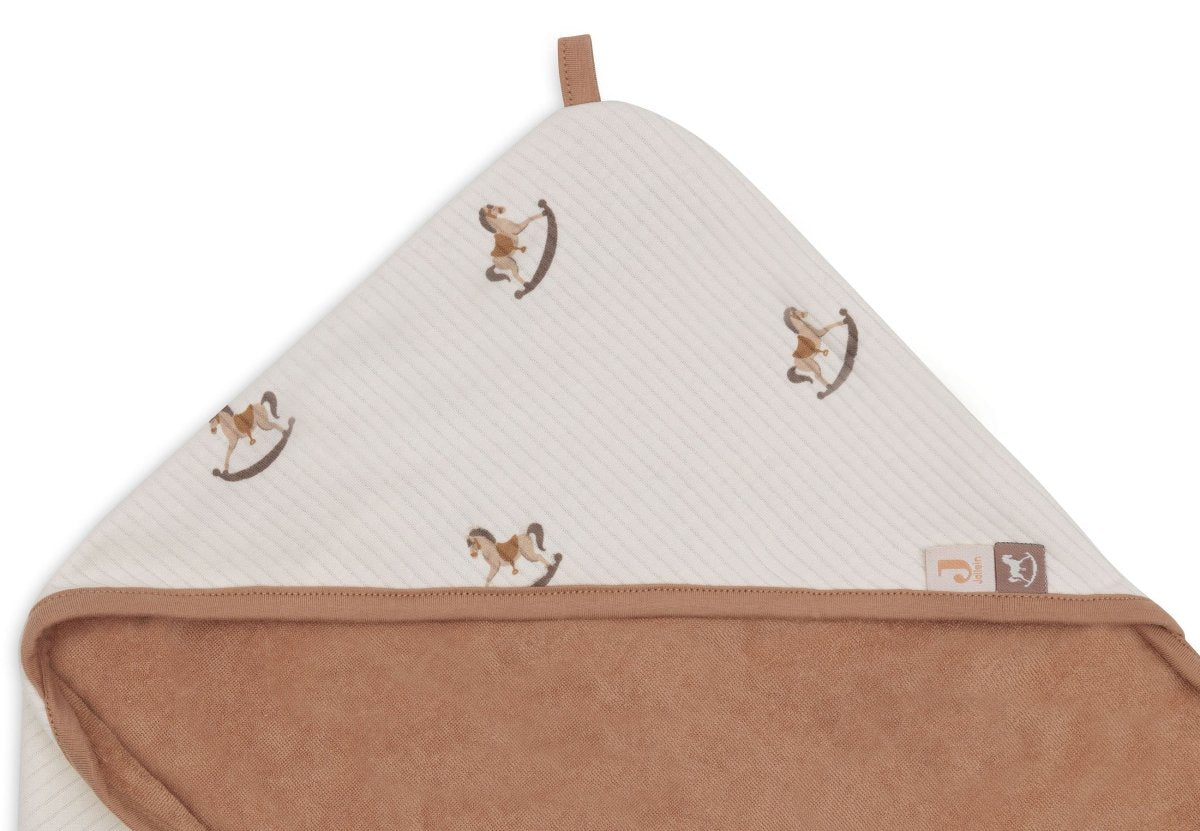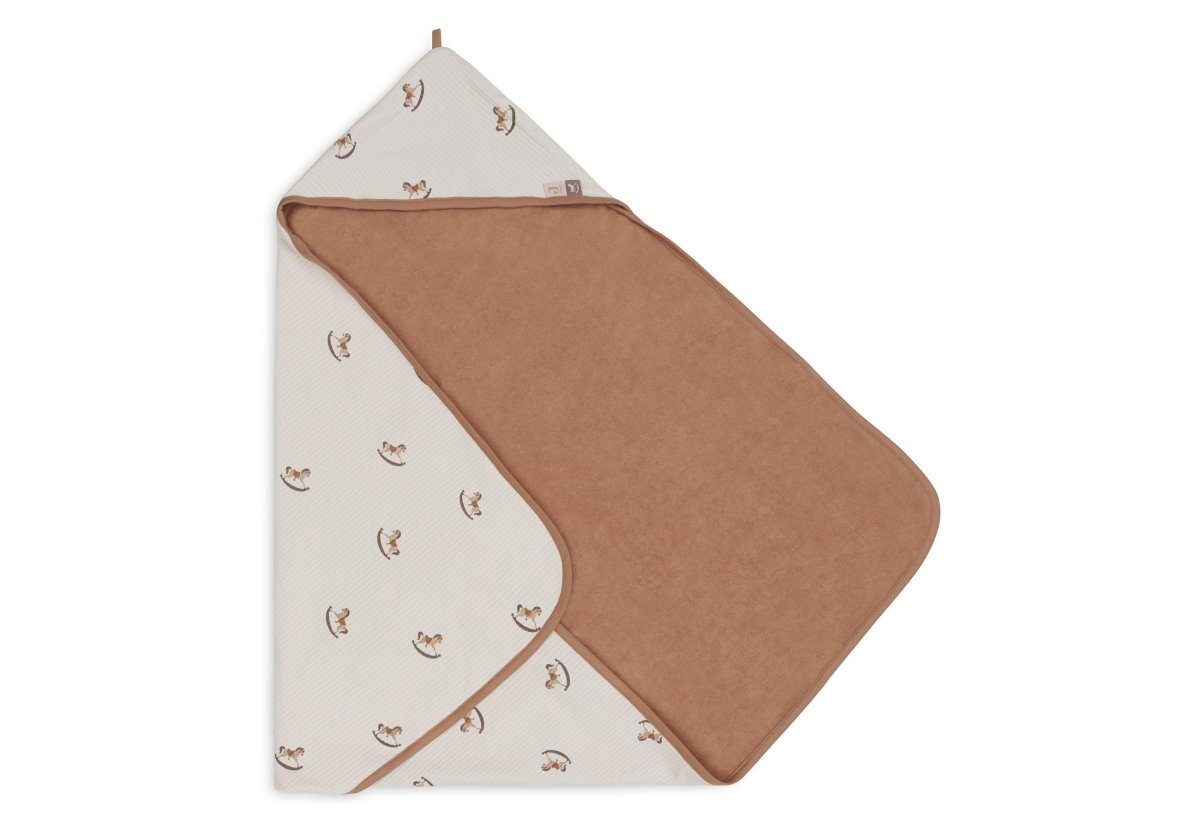 Vau, olemme ihastuneet tähän ihanaan kylpyviittaan! Tämä kylpyviitta on ihanteellinen kylpy- tai uintikerran jälkeen. Nostalgic Ride -kuosilla varustettuna voit kääriä vauvasi lämpimästi heti, kun hän tulee vedestä. Ulkopuoli on kauniisti kuviollinen, ja siinä on keinuhevosia, oatmeal-väri ja joustava kangas. Sisäpuoli on pehmeää terry-froteeta biscuit-värisenä. Myös reunus on tässä kauniissa Biscuit-värissä ja viimeistelee kylpyhuivin täydellisesti! Hupulla peität pään, jolloin se ei menetä lämpöä. Mukava! Pehmeä frotee on hellävarainen vauvan herkälle iholle ja imee kosteutta hyvin, joten kuivaus onnistuu hetkessä. Käytön jälkeen capen voi ripustaa helposti silmukasta.