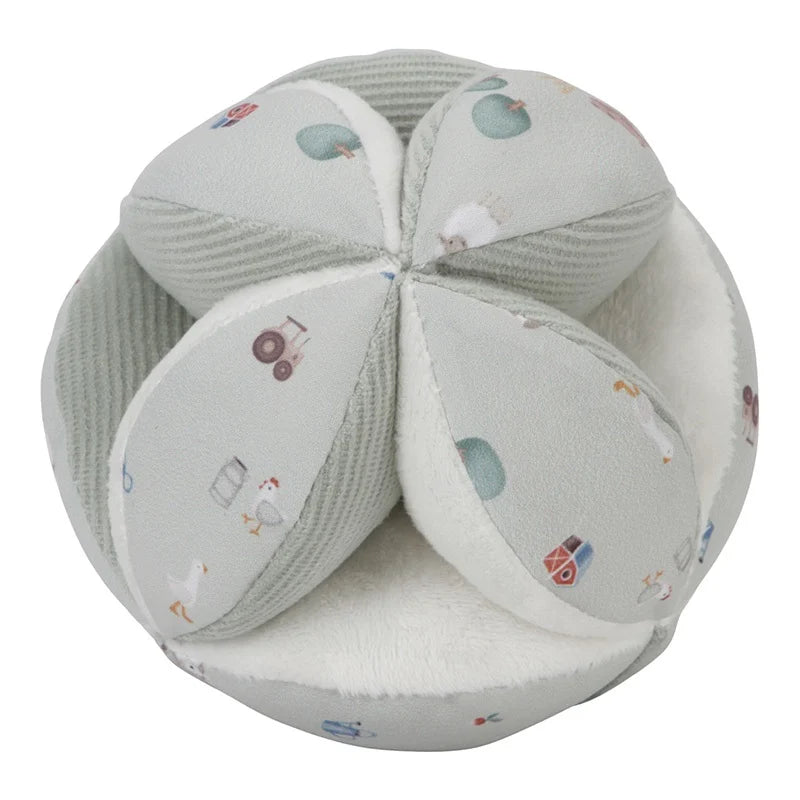 Yritäpä tarttua palloon! Tämä mielenkiintoisen muotoinen tartuntapallo tarjoaa upean haasteen pienokaisellesi. Erilaisilla tekstuureilla ja kuvioilla varustetut pinnat houkuttelevat tarttumaan ja tutkimaan. Pallo on helppo tarttua pienille käsille, ja iloinen helistimen ääni palkitsee vauvasi ponnistelut. Little Farm -sarjan kauniissa koristeissa on helposti tartuttavia, hauskoja etikettejä, jotka stimuloivat aisteja, kehittävät tarttumista ja pitävät vauvasi kiireisenä leikkikehässä.