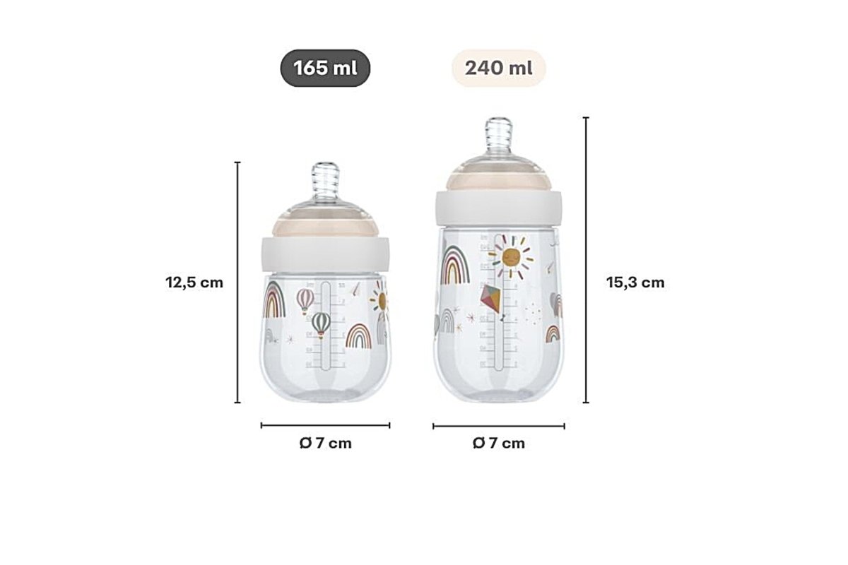- Kolikkosuojaus: Venttiili varmistaa tasaisen ilman virtauksen ja on suunniteltu pitämään ilma poissa vauvan vatsasta ruokailun aikana, mikä auttaa vähentämään vatsakramppeja ja epämukavuutta - Kierteinen muotoilu estää tukoksia - Luonnollinen tutin muoto ja lääketieteellistä laatua oleva silikoni - Leveä kaula helpottaa täyttöä ja puhdistusta - Läpinäkyvä sulkukorkki säilytystä varten - BPA-vapaa - Voidaan laittaa jääkaappiin, pakastimeen, mikroaaltouuniin ja astianpesukoneeseen