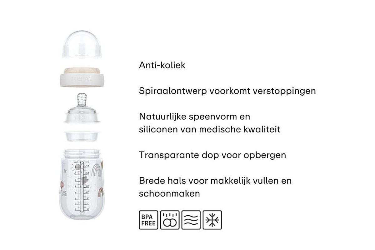 - Kolikkosuojaus: Venttiili varmistaa tasaisen ilman virtauksen ja on suunniteltu pitämään ilma poissa vauvan vatsasta ruokailun aikana, mikä auttaa vähentämään vatsakramppeja ja epämukavuutta - Kierteinen muotoilu estää tukoksia - Luonnollinen tutin muoto ja lääketieteellistä laatua oleva silikoni - Leveä kaula helpottaa täyttöä ja puhdistusta - Läpinäkyvä sulkukorkki säilytystä varten - BPA-vapaa - Voidaan laittaa jääkaappiin, pakastimeen, mikroaaltouuniin ja astianpesukoneeseen