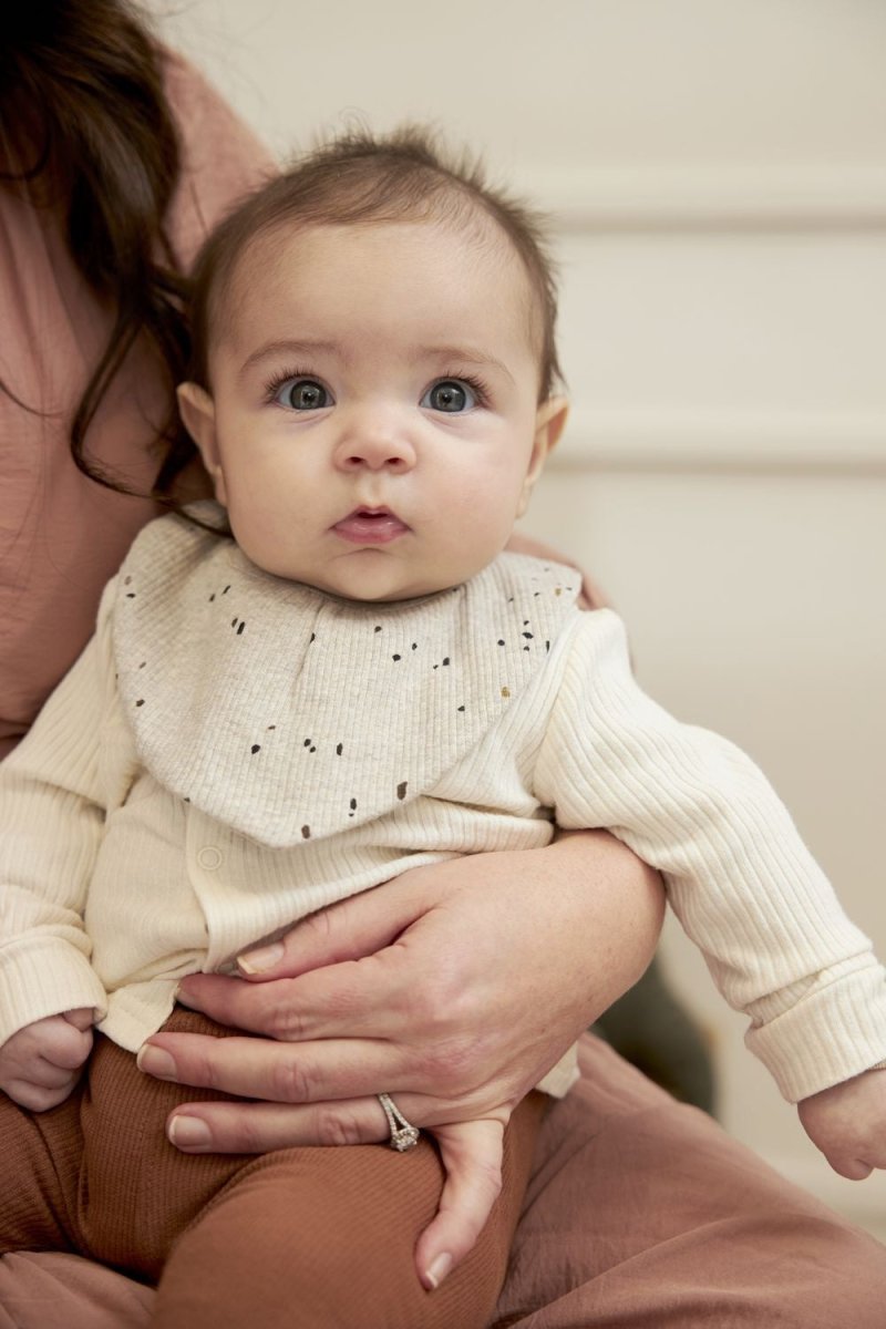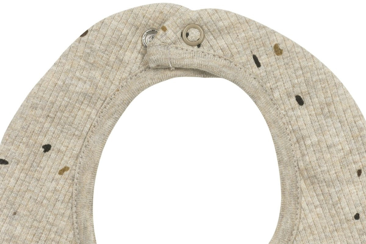 Bandana-ruokalaput on valmistettu 95% pehmeästä puuvillasta 95% ja5% elastaanista. Trendikäs ribbikangas tuo hauskan vivahteen, ja kangas on ihanan pehmeää ja joustavaa. Ruokalaput ovat saatavilla useissa melange-väreissä, ja niissä on Mini Spot -kuvio. Kuvio on minimalistinen, mutta se antaa bandanalle silti erittäin tyylikkään ilmeen, ja voit yhdistää sen helposti koko vauvan varustukseen.