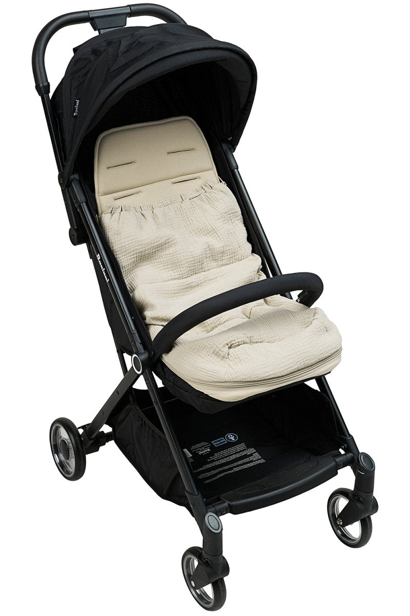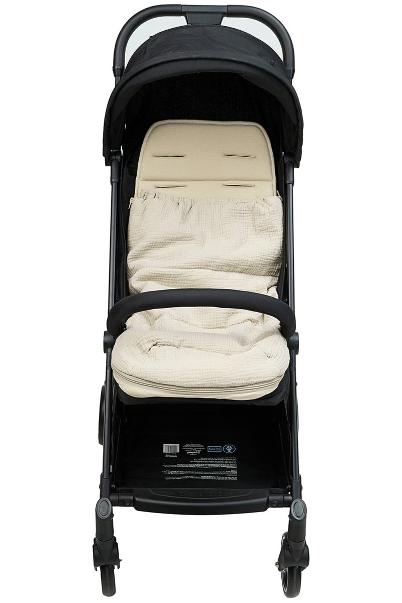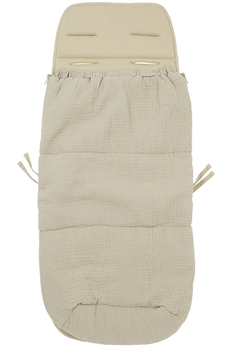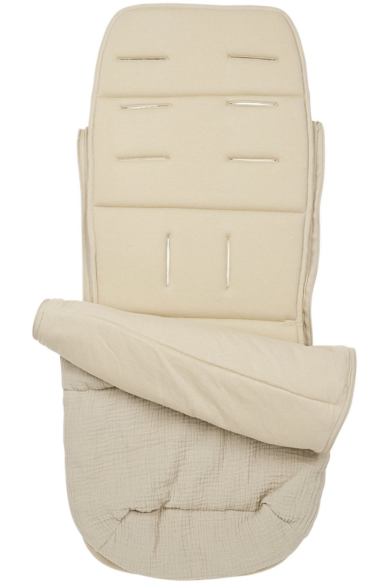 Jalkapussi on valmistettu 100% esipestyistä hydrofiilisistä puuvillakankaista, minkä ansiosta se tuntuu ihanan pehmeältä ja hengittää hyvin. Kevyt täyte on valmistettu 100% polyesteristä 100% . Pussin voi avata ja sulkea helposti vetoketjulla. Ja jos tulee liian kuuma, avaat sen vain vetoketjulla tai irrotat yläosan kokonaan, jolloin alaosaa voi käyttää rattaiden peitteenä. Kätevää, eikö?