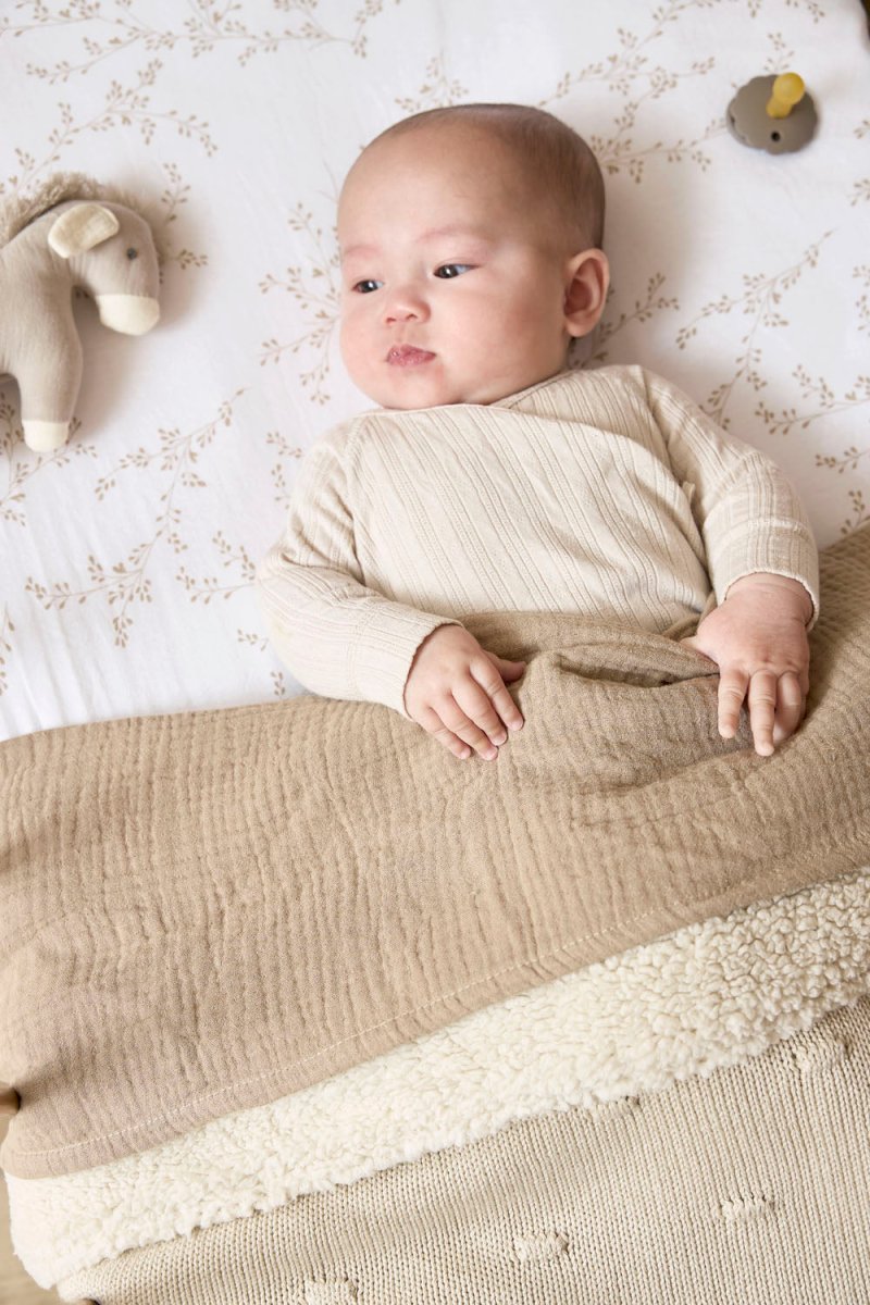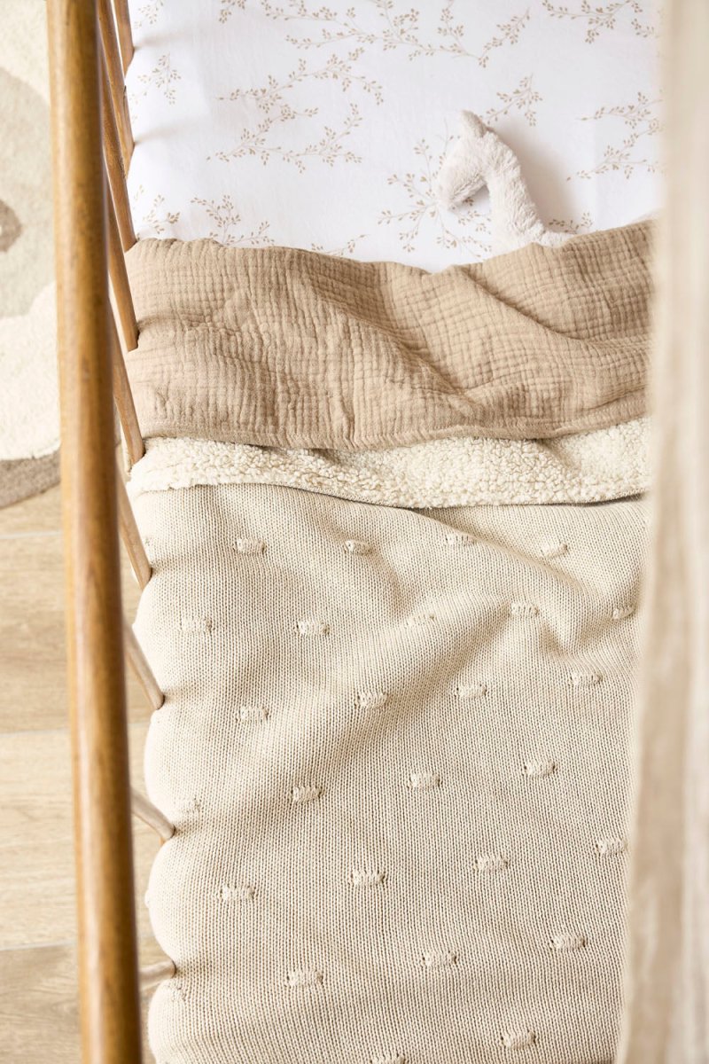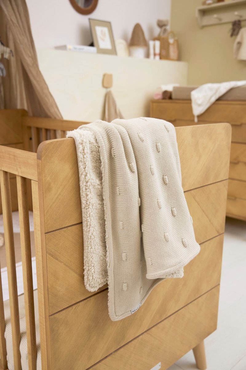 Tämän Meyco Baby Knots Teddy -peiton ansiosta lapsesi nauttii erityisen pehmeästä ja lämpimästä mukavuudesta. Peitto koostuu kahdesta kerroksesta: etupuoli on valmistettupuuvillasta 100% ja takapuoli polyesteristä 100% . Näin lapsellesi taataan sopiva lämpötila sängyssä sekä keväällä ja syksyllä että talvella. Käytä peittoa Meyco Baby -lakanan päällä sängyn petaamiseen.