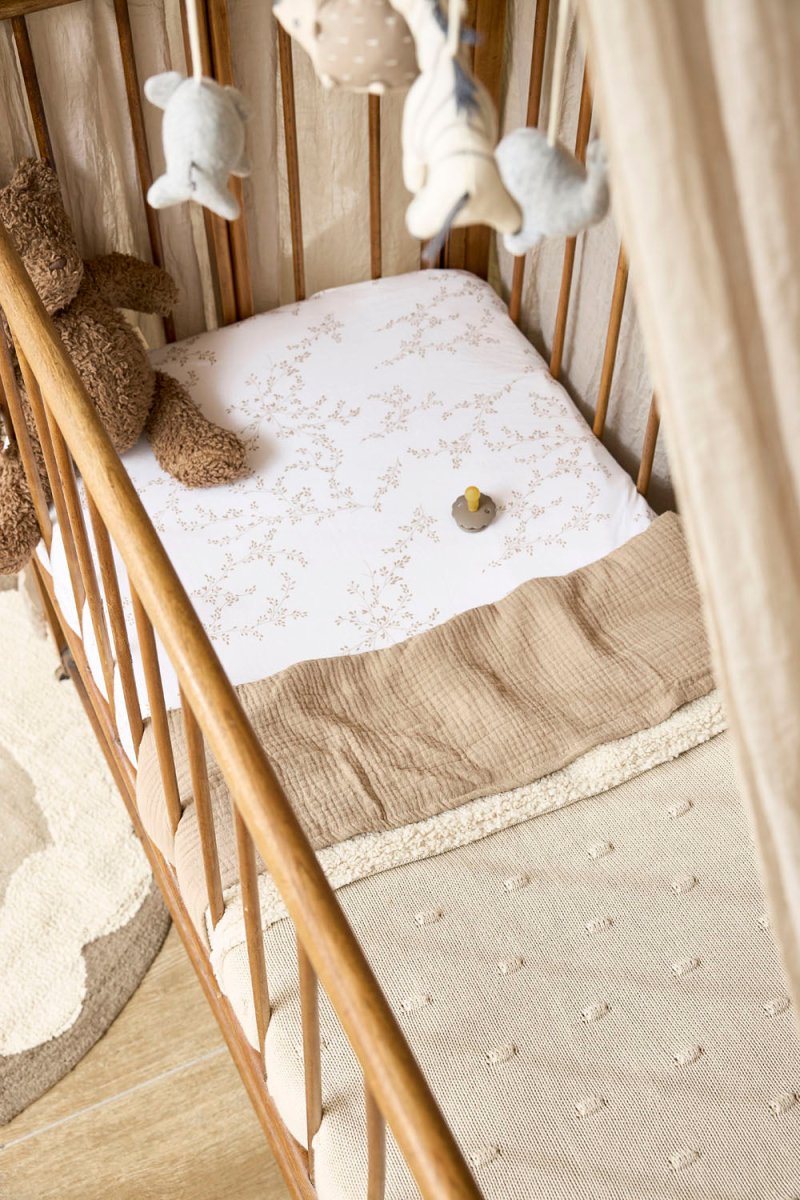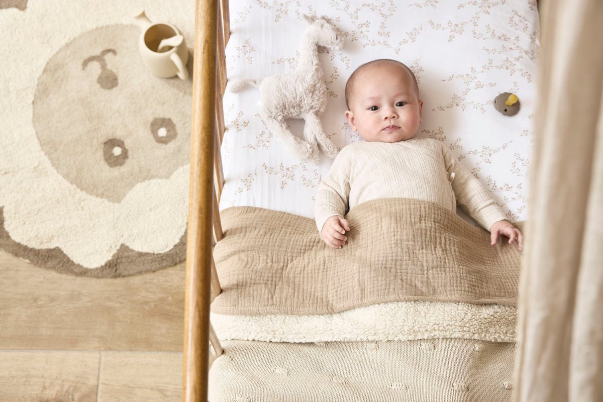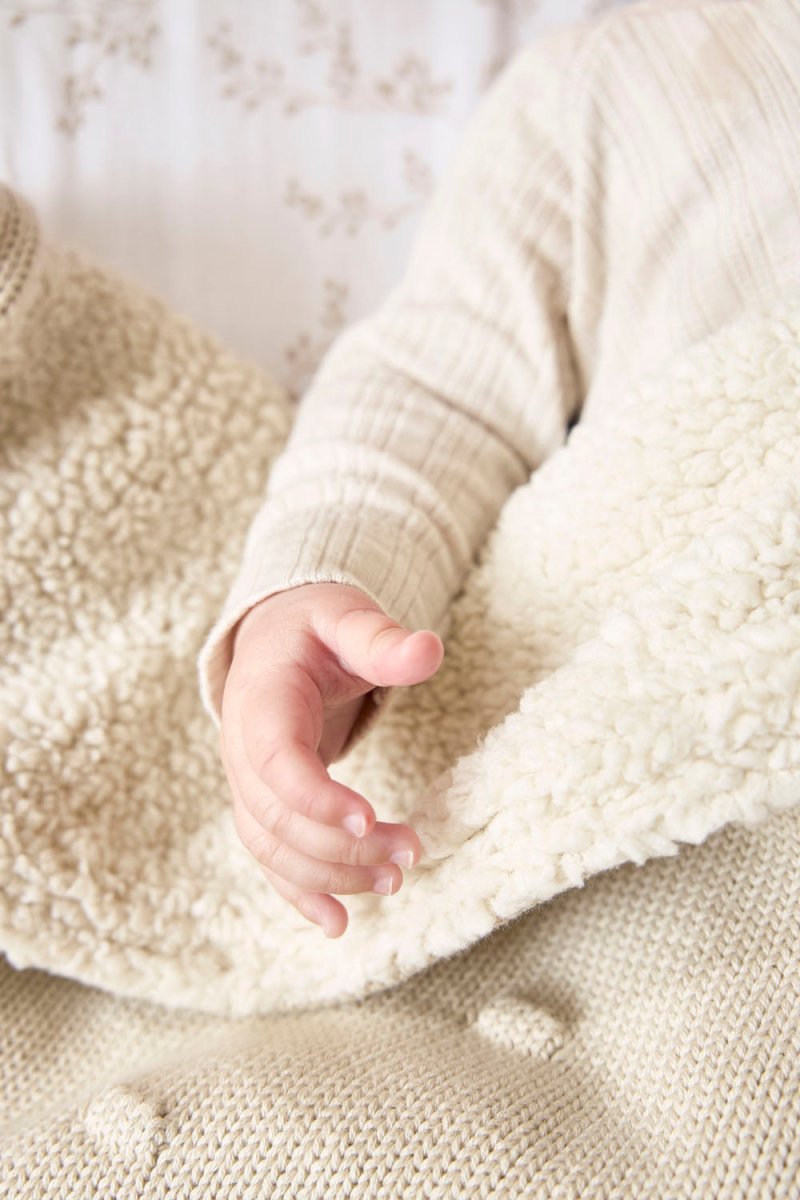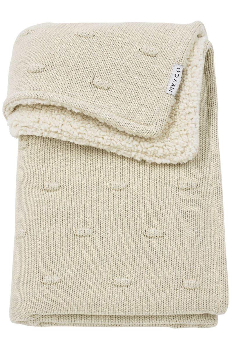 Tämän Meyco Baby Knots Teddy -peiton ansiosta lapsesi nauttii erityisen pehmeästä ja lämpimästä mukavuudesta. Peitto koostuu kahdesta kerroksesta: etupuoli on valmistettupuuvillasta 100% ja takapuoli polyesteristä 100% . Näin lapsellesi taataan sopiva lämpötila sängyssä sekä keväällä ja syksyllä että talvella. Käytä peittoa Meyco Baby -lakanan päällä sängyn petaamiseen.