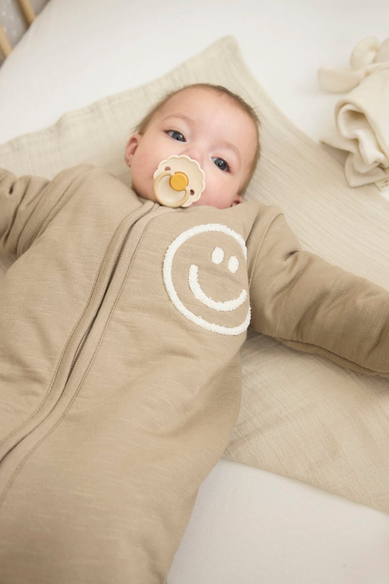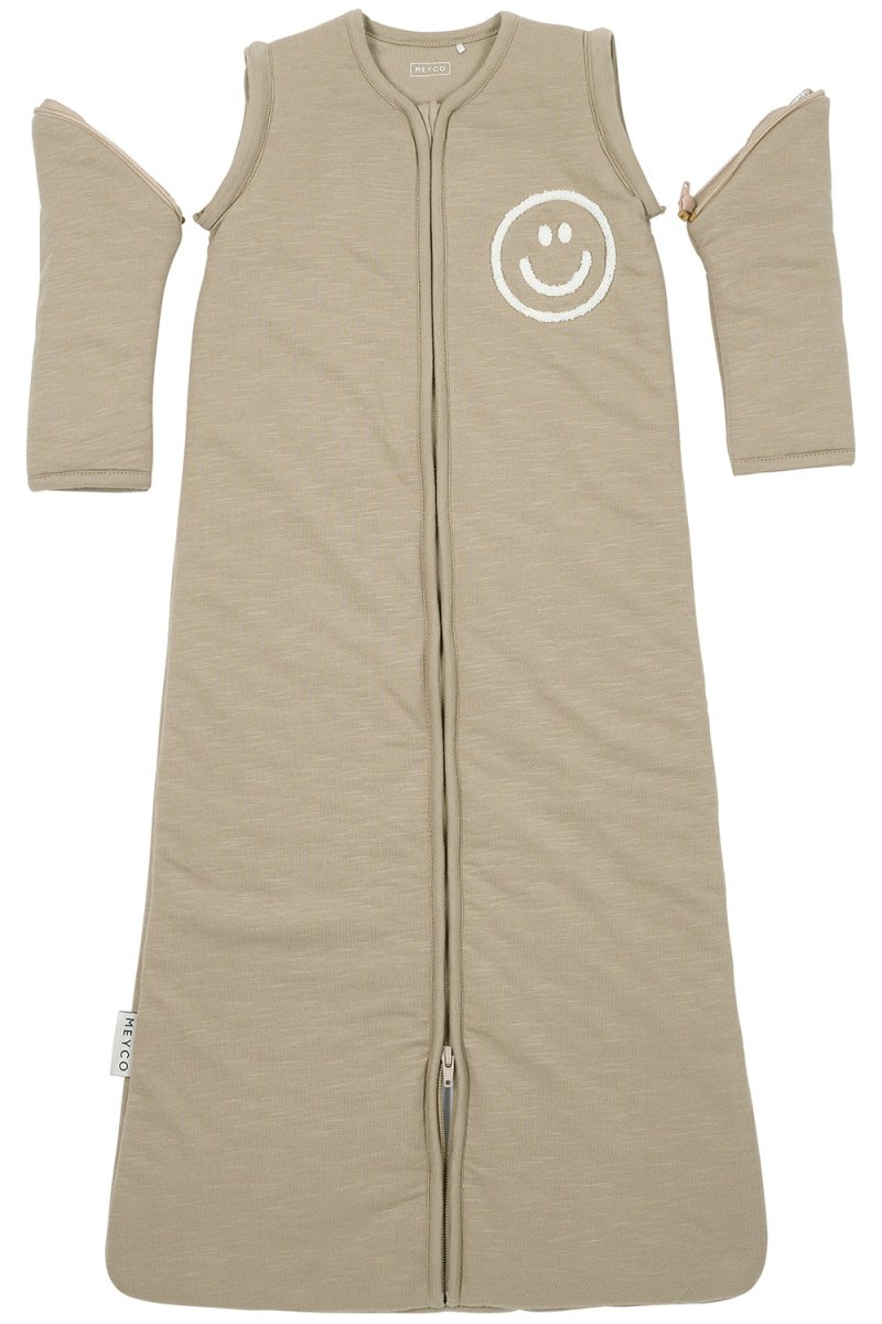 Tämä ihastuttava Meyco Baby Smile -makuupussi irrotettavilla hihoilla on ehdottomasti hankittava pienelle hymyilijällesi! Tämä suloinen makuupussi on valmistettu slub-puuvillasta, pehmeästä ja joustavasta materiaalista, joka tuntuu ihanalta lapsesi herkälle iholle. Ainutlaatuinen slub-efekti antaa makuupussille ylellisen, luonnollisen ilmeen. Pehmeä applikaatio, jossa on iloinen hymy, viimeistelee kokonaisuuden!