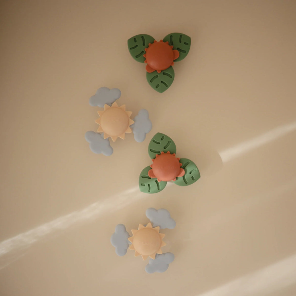 Leikkisällä muotoilullaan ja rauhoittavilla väreillään auringonpaiste-imulelumme herättää pienokaisesi mielikuvituksen. Lapset voivat 100% pyörittää auringon ympärillä olevia100% silikonipilviä 100%, mikä tarjoaa ihanan visuaalisen ja rauhoittavan aistikokemuksen. Vankka imukuppi pitää pyörän paikallaan, jotta se ei putoa vahingossa ja rohkaisee itsenäiseen leikkimiseen. Pidä vauvan huomio kiinnittyneenä kotona tai matkoilla kiinnittämällä lelu imukupilla lasten tuoleihin, kaapinoviin, lentokoneen tarjottimiin tai kylpyammeeseen.