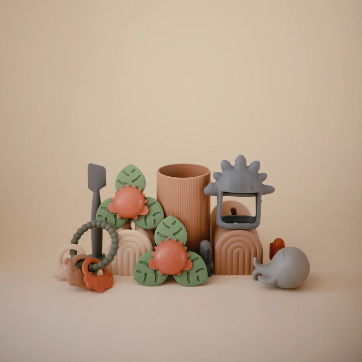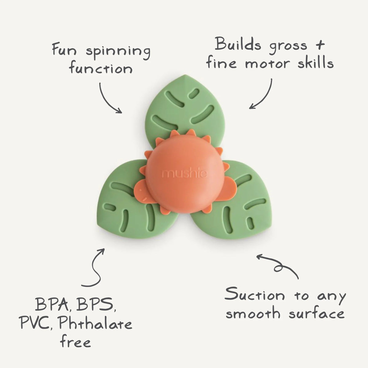 Leikkisällä muotoilullaan ja rauhoittavilla väreillään dino-imukuppimme herättää pienokaisesi mielikuvituksen. Lapset voivat 100% pyörittää dinosauruksen ympärillä olevia100% silikonilehtiä 100%, mikä tarjoaa ihanan visuaalisen ja rauhoittavan aistikokemuksen. Vankka imu pitää pyörivän lelun paikallaan, jotta se ei putoa vahingossa ja kannustaa itsenäiseen leikkimiseen. Pidä vauvan huomio kiinnittyneenä kotona tai matkoilla kiinnittämällä lelu imukupilla lasten tuoleihin, kaapinoviin, lentokoneen tarjottimiin tai kylpyammeeseen.