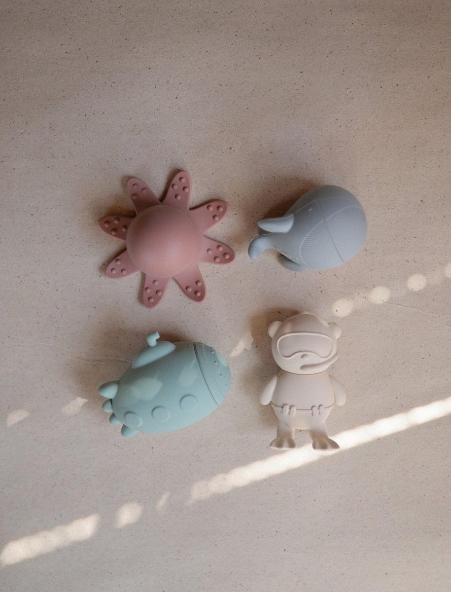 Tee kylpyhetkestä hauska merieläin-kylpyleikkisettillä, jossa on sukellusvene, sukeltaja, mustekala ja valas. Pehmeä materiaali on valmistettu 100%elintarvikekäyttöön soveltuvasta100% silikonista, ja pienet kädet pitävät siitä helposti kiinni sekä märkänä että kuivana. Nerokkaan muotoilun ansiosta jokainen lelu voidaan avata kahdeksi osaksi perusteellista puhdistusta ja nopeaa kuivumista varten. Tämän ominaisuuden ansiosta lelut pysyvät homeettomina, ja osat ovat helposti puhdistettavia ja astianpesukoneen kestäviä. Suosittelemme, että avaat osat jokaisen käytön jälkeen, huuhtelet ne ja annat niiden kuivua ilmassa ennen säilyttämistä.