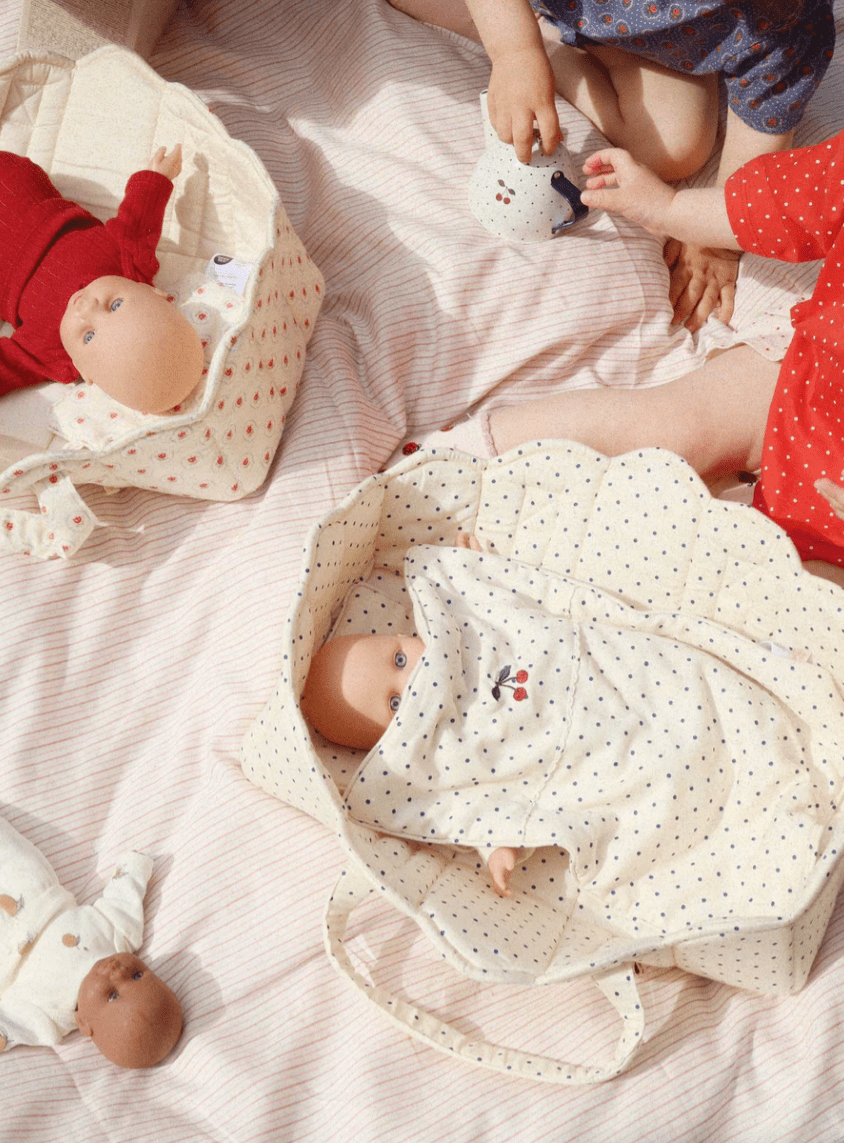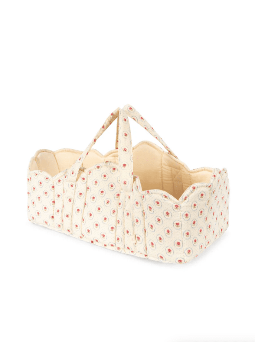 Konges Sløjd Mirage -nukkekori on täydellinen valinta pienille nuken vanhemmille, jotka haluavat kuljettaa nukkeaan mukavasti mukanaan kaikkialle. Pehmeiden kantohihnojen ja pehmustetun viimeistelyn ansiosta nukke on turvassa ja mukavasti. Koristeelliset nauhat ja aallotetut reunat antavat korille tyylikkään ja tunnistettavan ilmeen.
