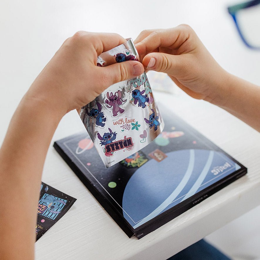 Näillä hauskoilla Stitchin, Lilon ja Angelin tarroilla voit koristella kaikki piirustuksesi, vihkosesi, muistikirjasi, korttisi ja kutsusi tai liimata ne mukana toimitettuun leikkitaustaan. Herätä Stitch-maailmasi täysin eloon!