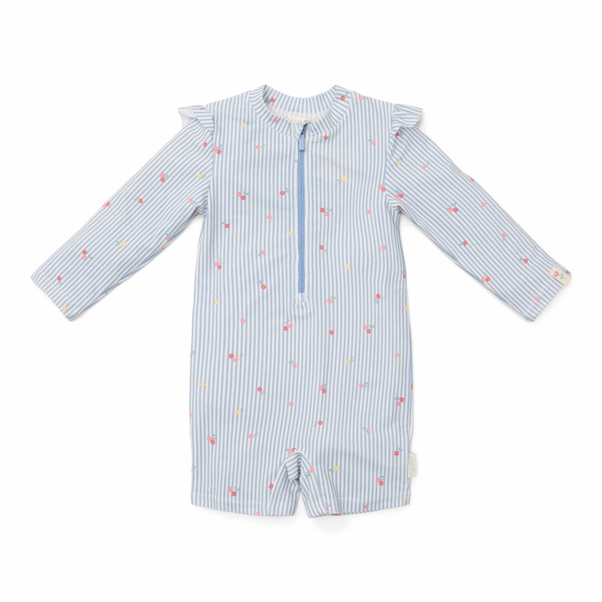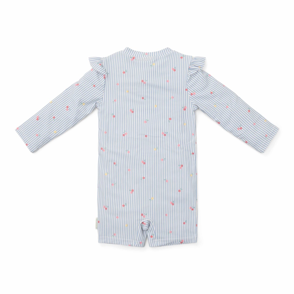 Sukella kesään tällä suloisella uimapuvulla, jossa on viehättävä Sunny Flowers -kuosi. Hienot siniset ja valkoiset raidat, joita koristavat pienet vaaleanpunaiset kukat, antavat puvulle romanttisen ilmeen. Se on täydellinen valinta rannalle tai uima-altaalle vietettävään päivään ja yhdistää mukavuuden ja eleganssin sekä leikkisät röyhelöt olkapäillä, jotta pikku tyttösi loistaa tyylikkäästi.