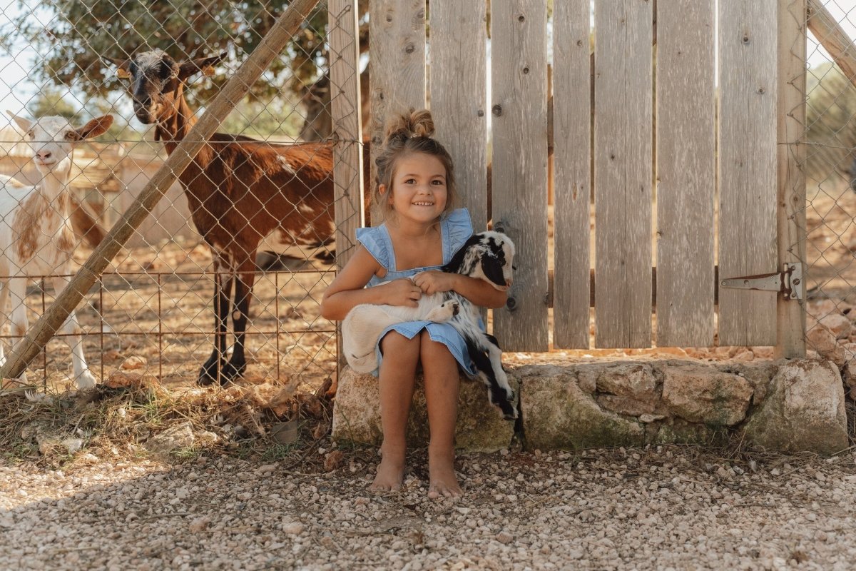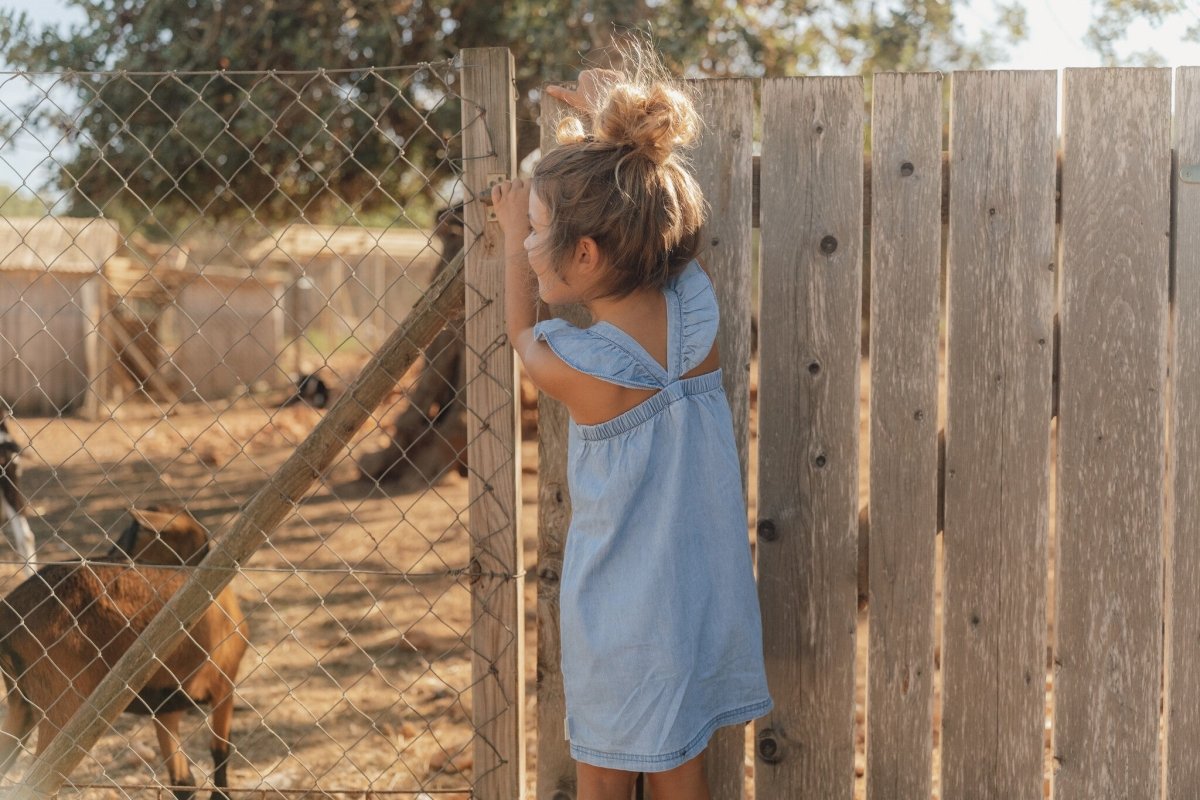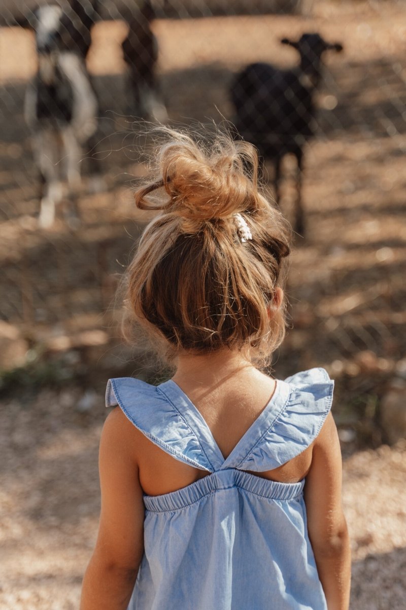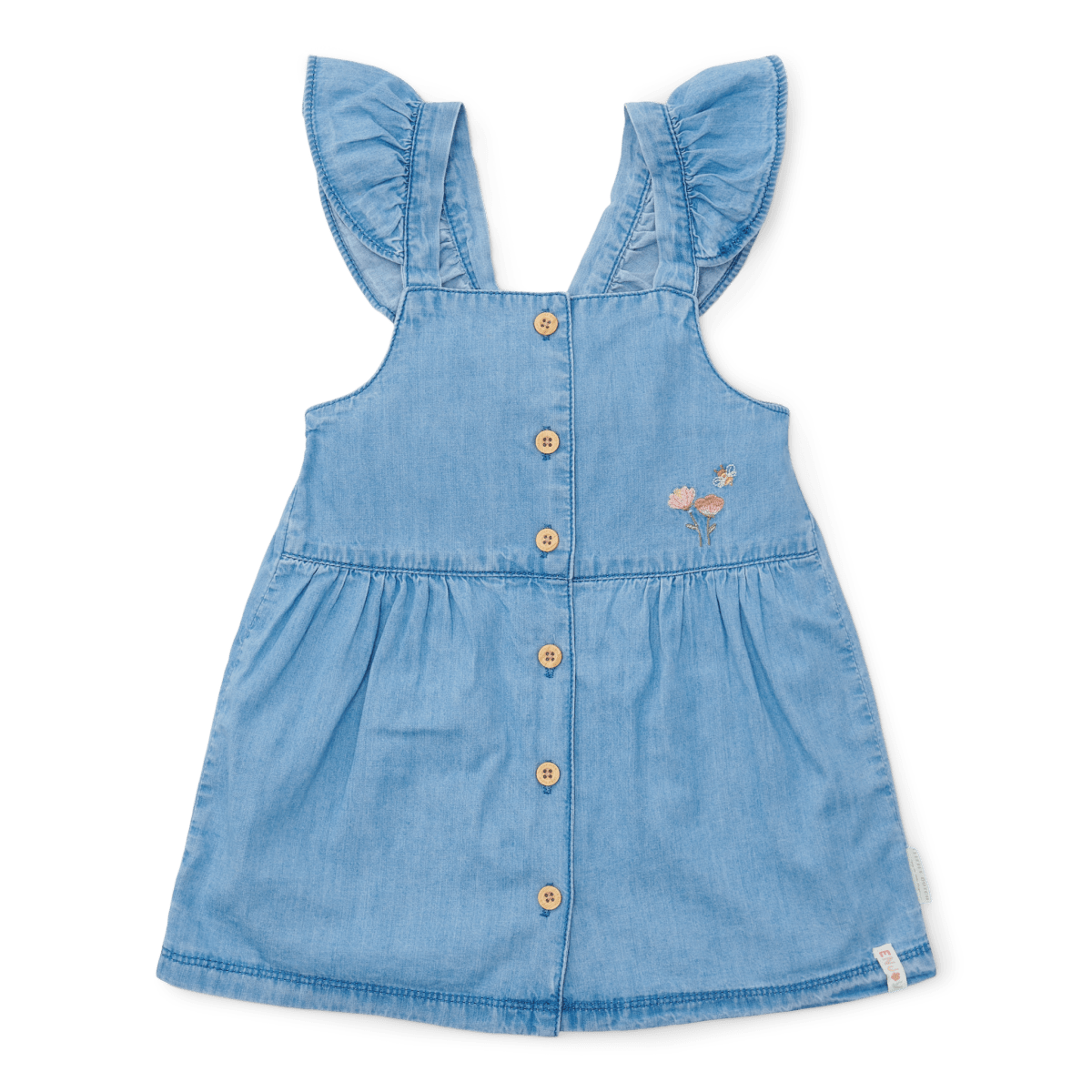 Tietenkään denim-mekko ei voinut puuttua tästä mallistosta. Niin söpö! Hihaton mekko on koristeltu iloisella brodeerauksella edessä, siinä on röyhelöt olkaimissa, joustava vyötärö ja hienot puunväriset napit. Ihanan pehmeästä puuvillasta valmistettu denim-mekko on ihanteellinen leikkimiseen koko päiväksi.