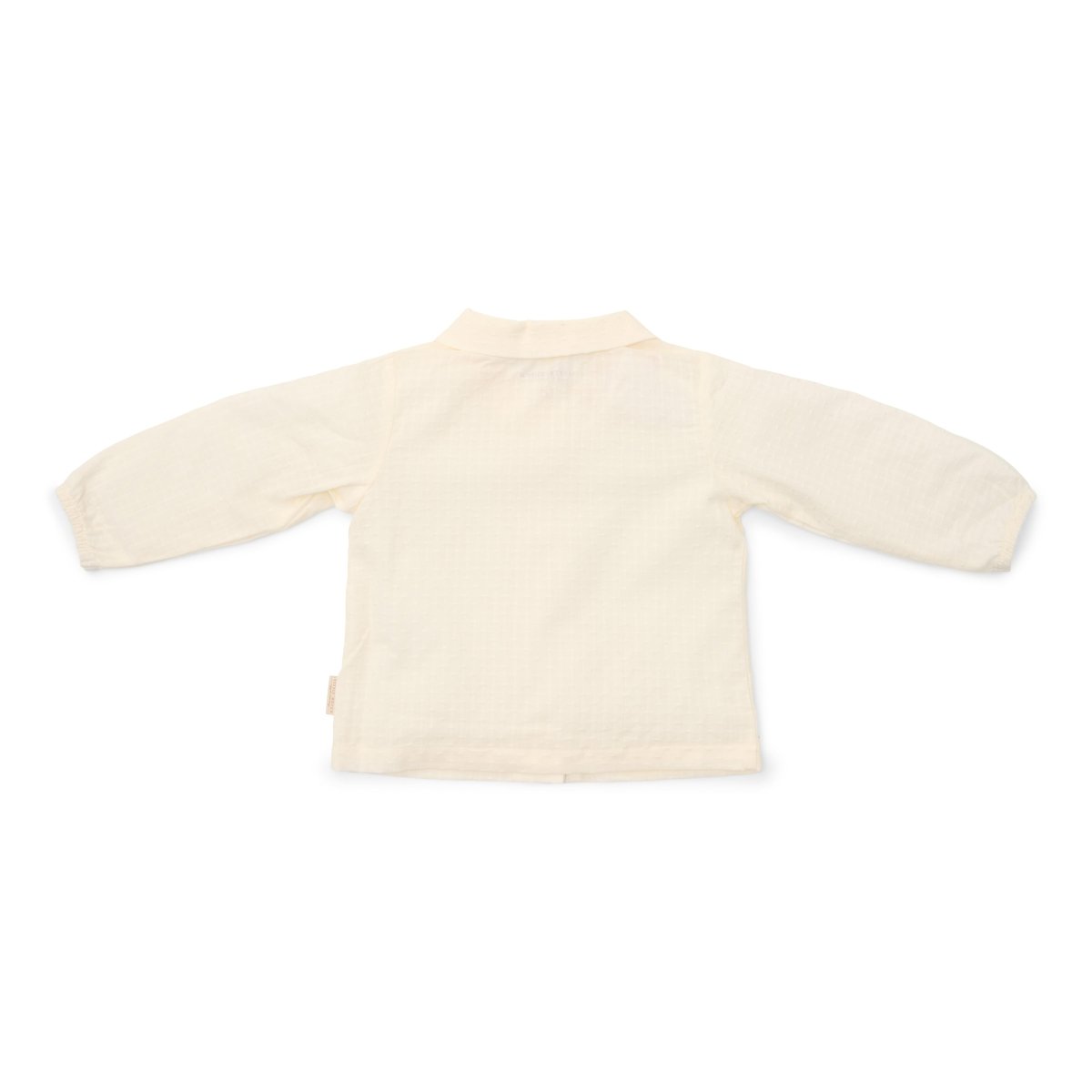 Anna mielikuvituksesi lentää! Tämä lumoava kermanvalkoinen pitkähihainen pusero on sekä tyylikäs että monipuolinen. Kevyt kangas, jossa on teksturoitu pistekuvio, on koristeltu herkillä yksityiskohdilla, jotka tekevät siitä erityisen suloisen. Pusero on valmistettu luomupuuvillasta ja se sulkeutuu puun näköisillä napeilla, joista yksi on silmiinpistävä kukanmuotoinen nappi. Helma on viimeistelty hienovaraisella röyhelöllä, mikä korostaa puseron suloista ja leikkisää ilmettä.