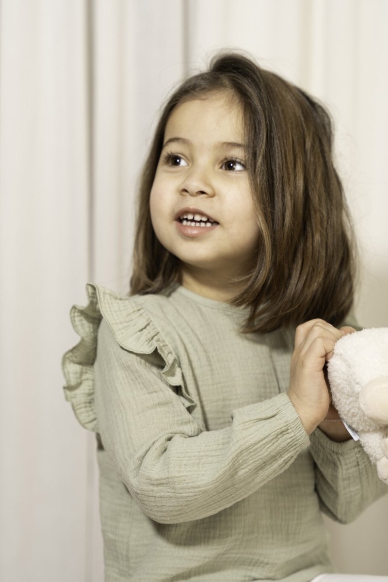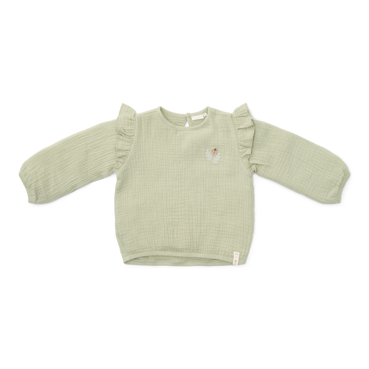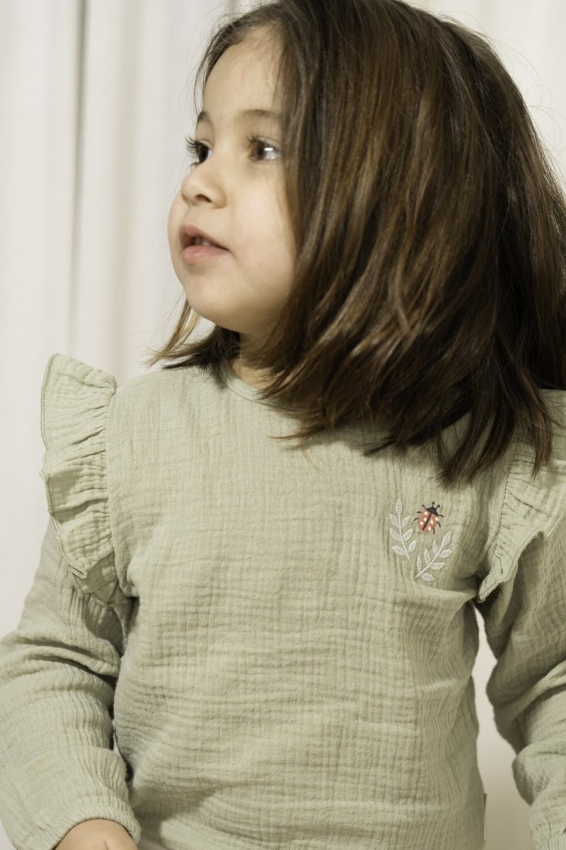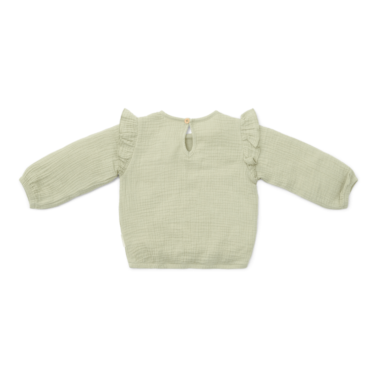 Tämä ihanan pehmeä musliinipusero on pitkähihainen ja mukavan istuva. Se on valmistettu orgaanisesta puuvillasta, joka tuntuu ihanan pehmeältä lapsesi iholla. Raikas vihreä väri ja rintakoristelu tuovat iloa! Puserossa on joustavat hihansuut, joten se istuu mukavasti, ja takana on joustava napitus, jonka ansiosta pusero on helppo pukea ja riisua.