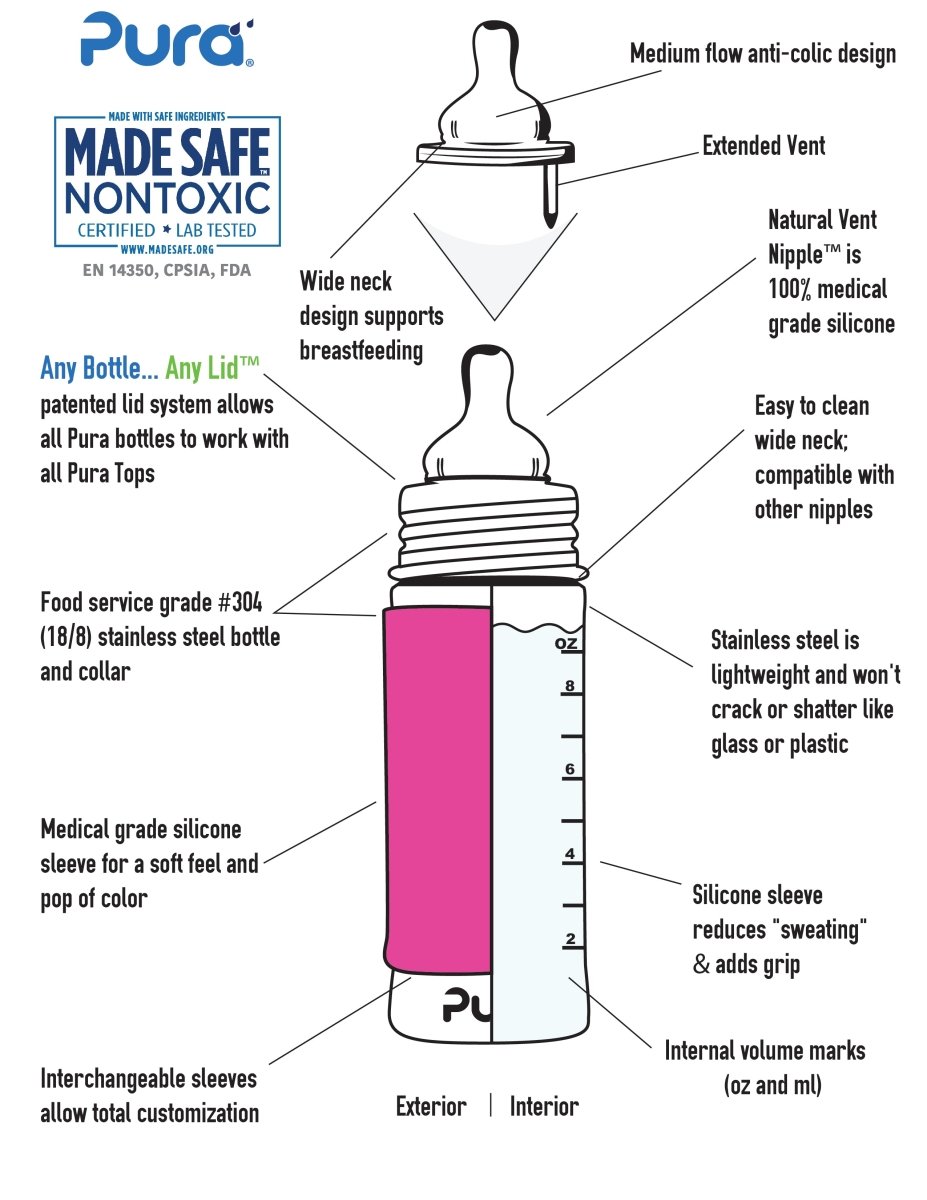 Tämä palkittu ruostumattomasta teräksestä valmistettu tuttipullo on täydellinen juomapullo vauvoille ja 100% muoviton! Pullo on muoviton, joten se on turvallinen, ympäristöystävällinen ja ennen kaikkea käytännöllinen. Korkki on vaihdettava, minkä ansiosta pulloa voidaan käyttää monin eri tavoin. Näin pullo kasvaa mukana vauvan kehityksen mukana tuttipullosta juomamukiksi, pillimukiksi ja urheilupulloksi. Pura on ainoa maailmassa, jolla on NONToxic-sertifikaatti. MadeSafe.org.