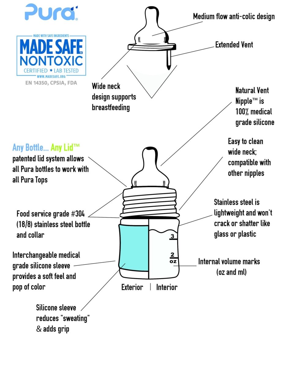 ämä palkittu ruostumattomasta teräksestä valmistettu tuttipullo on täydellinen juomapullo vauvoille ja 100% muoviton! Pullo on muoviton, joten se on turvallinen, ympäristöystävällinen ja ennen kaikkea käytännöllinen. Korkki on vaihdettava, minkä ansiosta pulloa voidaan käyttää monin eri tavoin. Näin pullo kasvaa mukana vauvan kehityksen mukana tuttipullosta juomamukiin, pillimukiin ja urheilupulloon. Pura on ainoa maailmassa, jolla on NONToxic-sertifikaatti. MadeSafe.org. Miksi Pura: TURVALLINEN: Ainoa 100% muoviton pullo... joten ei turvallisuusriskiä; Valmistettu korkealaatuisesta ruostumattomasta teräksestä (#304 tai 18/9-laatu); Antibakteerista lääketieteellistä laatua oleva silikoni; MadeSafe™-sertifioitu; Pidentä Pura-pullojen käyttöikää vaihtamalla korkkia. Näin pullot kestävät koko eliniän; Ei sisällä BPA:ta, PVC:tä, ftalaatteja eikä lyijyä; Pullon mukana toimitetaan hitaasti virtaava silikoninen tutti, silikoninen matkakorkki ja silikoninen suojus; Tilavuus: 150 ml; Sisäinen tilavuusmerkintä: 100 ml.Pura-nännit on suunniteltu jäljittelemään imetyksen vaihtelevaa virtausta. Nämä tutit on suunniteltu sopimaan täydellisesti vauvan suuhun. Patentoitu ilmastointiventtiili on erityisen pitkä ja auttaa ehkäisemään koliikkia ja maidon refluksitautia. Pura-pulloja voidaan käyttää nesteen jäädyttämiseen, käytä erikseen saatavaa silikonitiivistelevyä. Älä täytä pulloa liikaa, neste laajenee jäätyessään (enintään 120 ml 150 ml:n pullossa). Puhdistus ja sterilointi Kaikki Pura-pullojen ja -tarvikkeiden osat ovat astianpesukoneen kestäviä. Voit pestä ne myös käsin miedolla saippualla ja pullon ja nännin harjalla. Vältä voimakkaiden pesuaineiden käyttöä, sillä ne voivat vahingoittaa silikoniosia. Tarvikkeet kestävät kauemmin, jos ne puhdistetaan hellävaraisesti käsin. Pura-tuotteet voidaan myös steriloida. Tätä varten laita pullo ja tarvikkeet 5–10 minuutiksi kiehuvaan veteen sen jälkeen, kun kattila on otettu liedeltä ja vesi ei enää kiehu voimakkaasti. Silikoniosat voidaan myös steriloida mikroaaltouunissa.