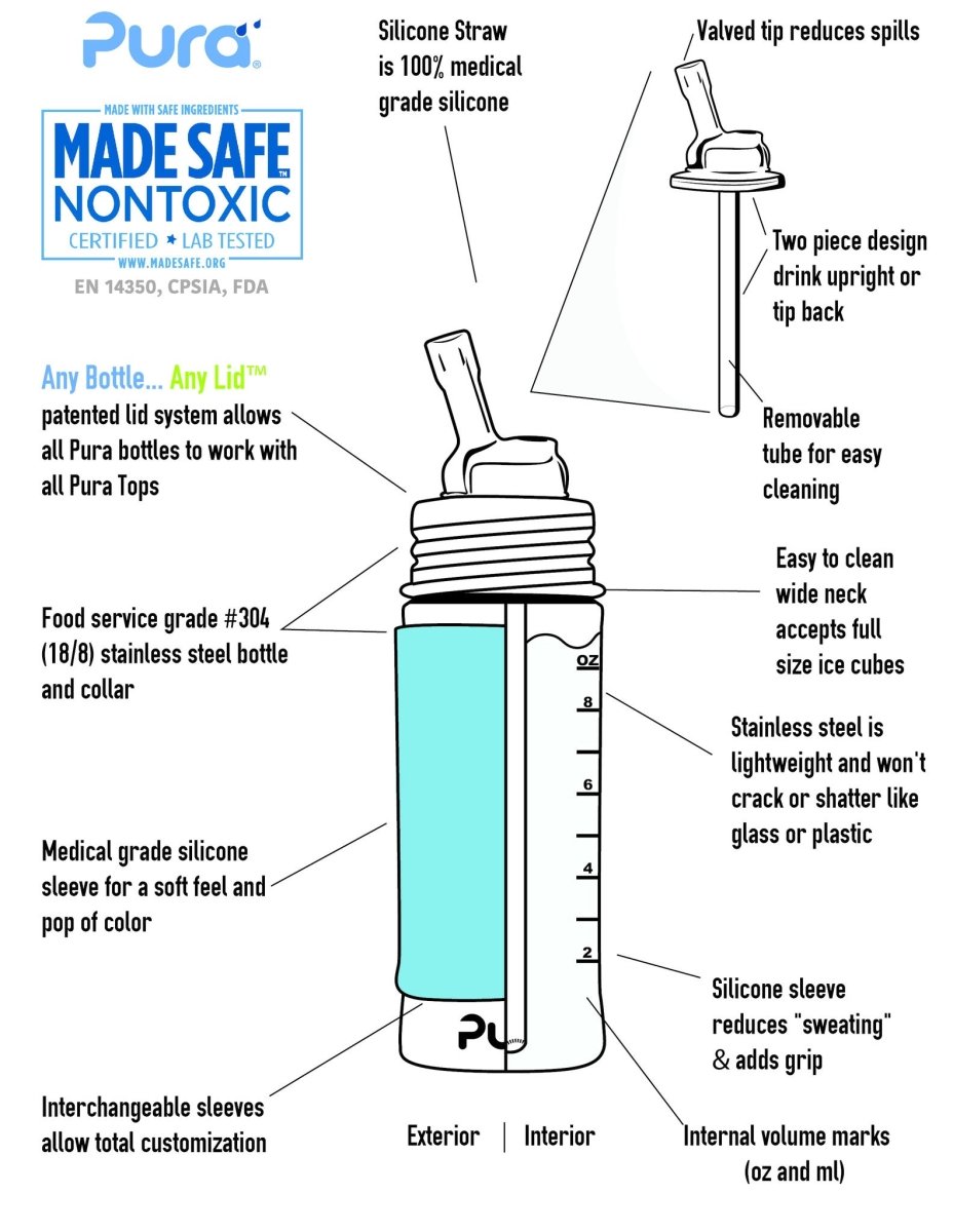 palkittu ruostumattomasta teräksestä valmistettu juomapullo on täydellinen juomapullo vauvoille ja 100% muoviton! Pullo on muoviton, joten se on turvallinen, ympäristöystävällinen ja ennen kaikkea käytännöllinen. Korkki on vaihdettava, minkä ansiosta pulloa voidaan käyttää monin eri tavoin. Näin pullo kasvaa mukana vauvan kehityksen mukana juomamukista pillimukiksi ja urheilupulloksi. Pura on ainoa maailmassa, jolla on NONToxic-sertifikaatti. MadeSafe.org. Miksi Pura: TURVALLINEN: Ainoa 100% muoviton pullo... joten ei turvallisuusriskiä; Valmistettu korkealaatuisesta ruostumattomasta teräksestä (#304 tai 18/9-laatu); Antibakteerista lääketieteellistä laatua oleva silikoni; MadeSafe™-sertifioitu; Pidentä Pura-pullojen käyttöikää vaihtamalla korkkia. Näin pullot kestävät koko eliniän; Ei sisällä BPA:ta, PVC:tä, ftalaatteja eikä lyijyä; Pullon mukana toimitetaan silikonisuutin, silikoninen matkakorkki ja silikoninen suojus; Tilavuus: 325 ml; Sisäinen tilavuusmerkintä: 250 ml.Pura-suunnittelutiimi on pyrkinyt kehittämään markkinoiden parhaan muovittoman juomasuihkun. Johtavien lastenlääkäreiden neuvojen mukaisesti tämä suihku on kehitetty tukemaan hampaiden ja ikenien luonnollista kehitystä. Pura-suihkun yläosa on vahvistettu, jotta se kestää kasvavien pikkulasten puremisvaistoa. Pura-pulloja voidaan käyttää nesteen jäädyttämiseen, käytä erikseen saatavaa silikonitiivistelevyä. Älä täytä pulloa liikaa, neste laajenee jäätyessään (enintään 275 ml 325 ml:n pullossa). Puhdistus ja sterilointi Kaikki Pura-pullojen ja -tarvikkeiden osat ovat astianpesukoneen kestäviä. Voit pestä ne myös käsin miedolla saippualla ja pullon ja nännin harjalla. Vältä kovien pesuaineiden käyttöä, sillä ne voivat vahingoittaa silikoniosia. Tarvikkeet kestävät kauemmin, jos ne puhdistetaan hellävaraisesti käsin. Pura-tuotteet voidaan myös steriloida. Laita pullo ja lisävarusteet 5–10 minuutiksi kiehuvaan veteen sen jälkeen, kun kattila on otettu liedeltä ja vesi ei enää kiehu voimakkaasti. Silikoniosat voidaan steriloida myös mikroaaltouunissa.