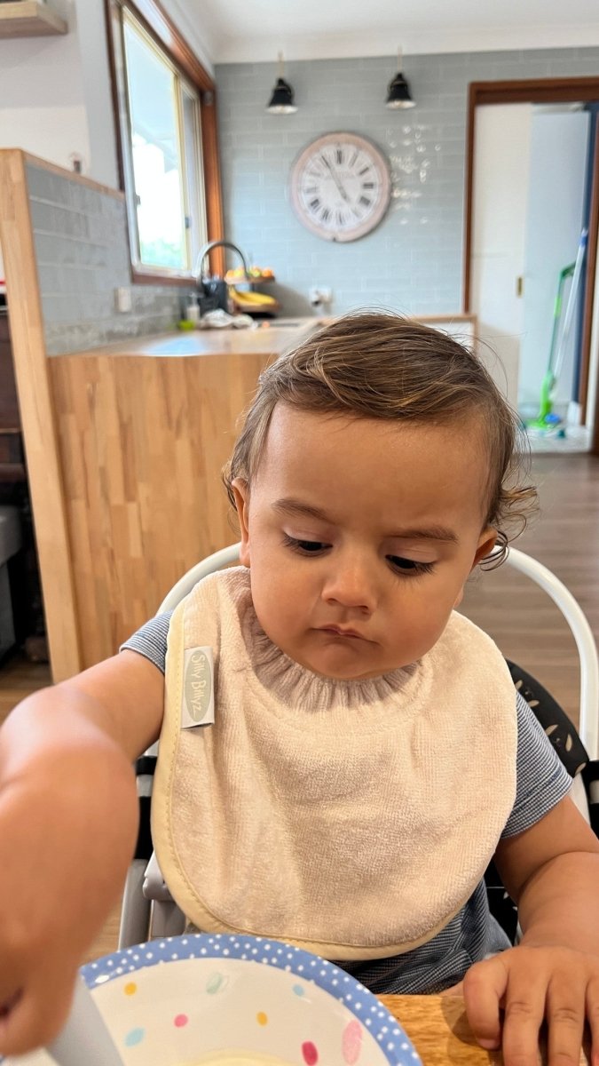 TämäSilly Billyzin Large White Sand -ruokalappuon ihanteellinen vauvoille, joilla on refluksi, hampaita tulossa tai jotka sylkevät paljon, ja se varmistaa, että jokainen ruokailu sujuu siististi ja mukavasti!