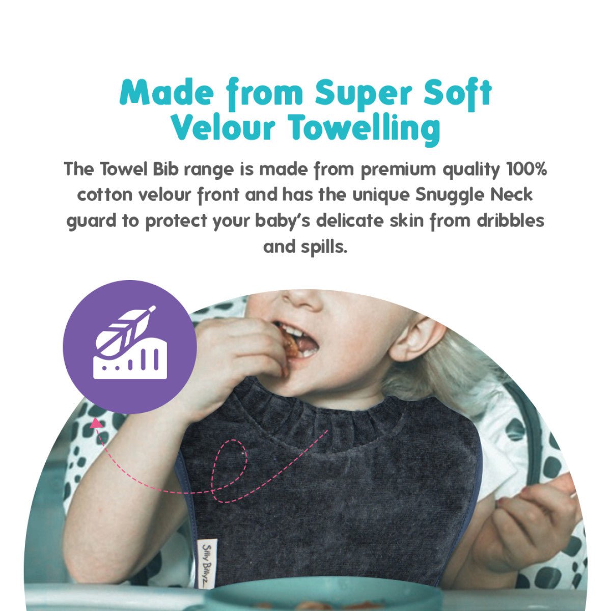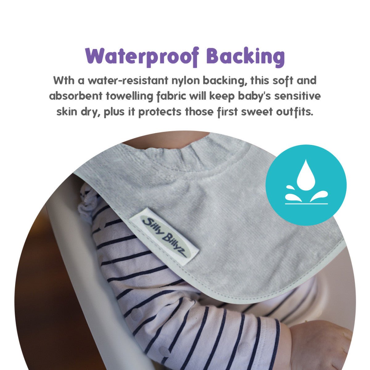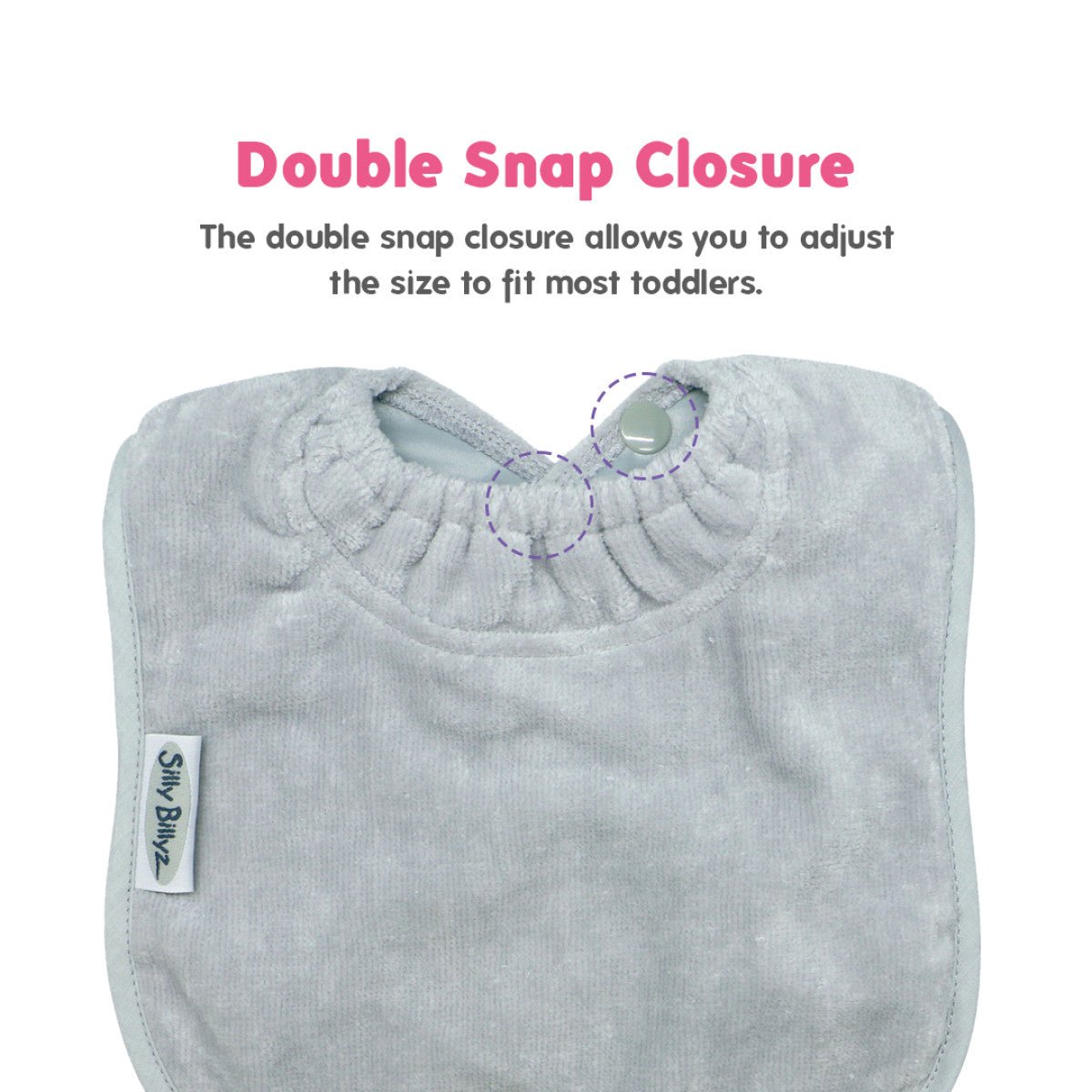 TämäSilly Billyzin Large Silver -ruokalappuon ihanteellinen vauvoille, joilla on refluksi, hampaita tulossa tai jotka sylkevät paljon, ja se varmistaa, että jokainen ateria sujuu puhtaasti ja mukavasti!